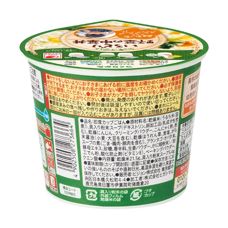 | 原材料 | 乾燥米(うるち米 (国産))、具入り粉末スープ(デキストリン、卵加工品(乳成分を含む)、乾燥にんじん、クリーミングパウダー、こんにゃく粉、粉末醤油(小麦・大豆を含む)、乾燥ほうれん草、食塩、がらスープの素(ごま・鶏肉・豚肉を含む)、プランタゴ・オバタ末、酵母エキス、砂糖、香辛料、生姜パウダー、かに殻粉末)/加工でん粉、酸化防止剤(ビタミンE)、ベーキングパウダー、クエン酸 |